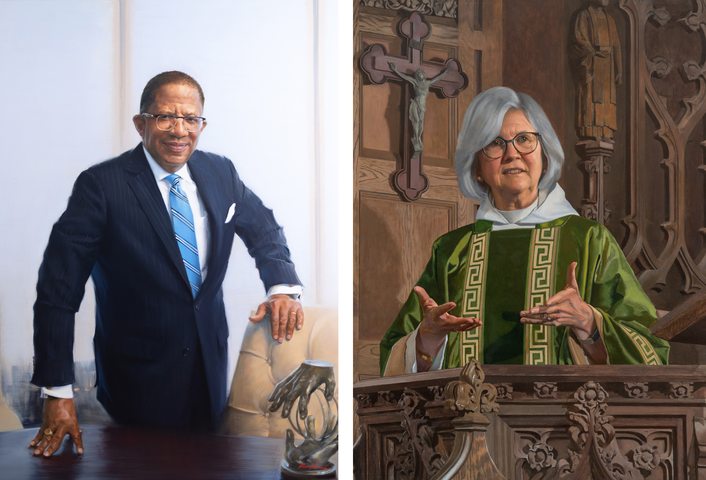 The return to larger portraits similarly points to more traditional aspects of portraiture. These portraits are more sizable in both sheer scale and the number of figures featured in each composition. While head and shoulder portraits have dominated the past several years, there has recently been a steady rise in the classical three-quarter figure. This minor change often makes all the difference between the feeling of a bust and setting a more complete scene. While head and shoulder portraits commonly are set on simple neutral or color-block backgrounds, three-quarter portraits are surrounded by an environment of importance to the subject. The artist has more agency in building a world around the character.