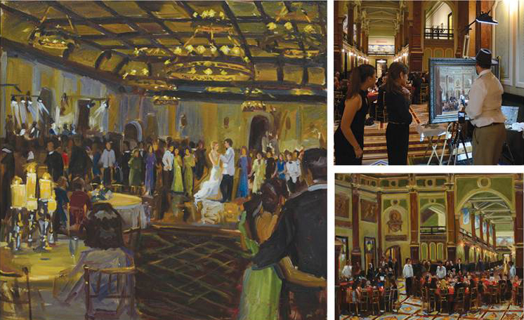 The artist and client will discuss the main focus of the painting prior to the event (for example, the first dance between the bride and groom or a key note speaker).