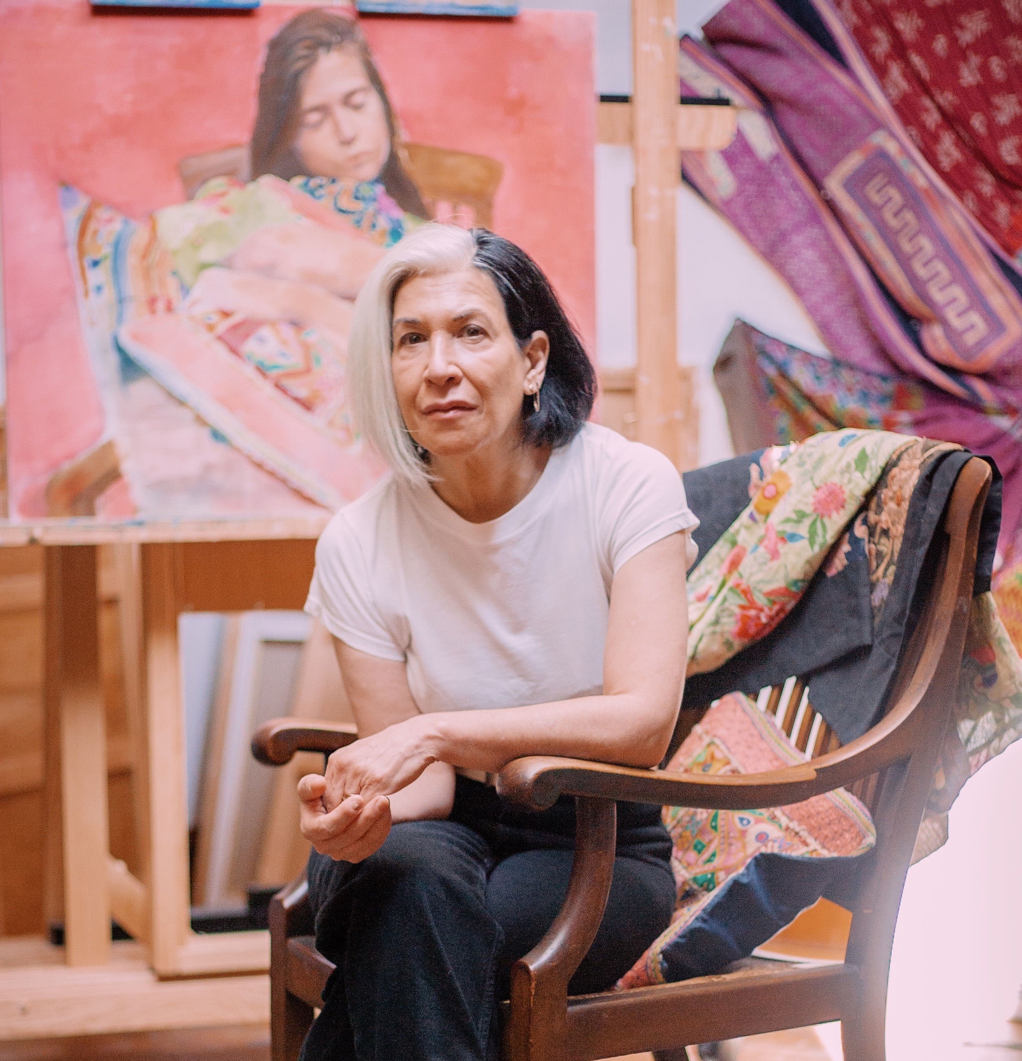 You can often find Portraits, Inc. Master Artist Sharon Sprung surrounded by a different urban hustle and bustle than the hum of Carol Kirby’s Atlanta traffic. Her Brooklyn studio occupies a busy stretch of growing commercial spaces. In her studio, however, you find a peaceful haven for art-making. Collected fabrics and patterns cover walls and fill corners of the room, while treasured northern light spills over stretched canvas and oil paints.