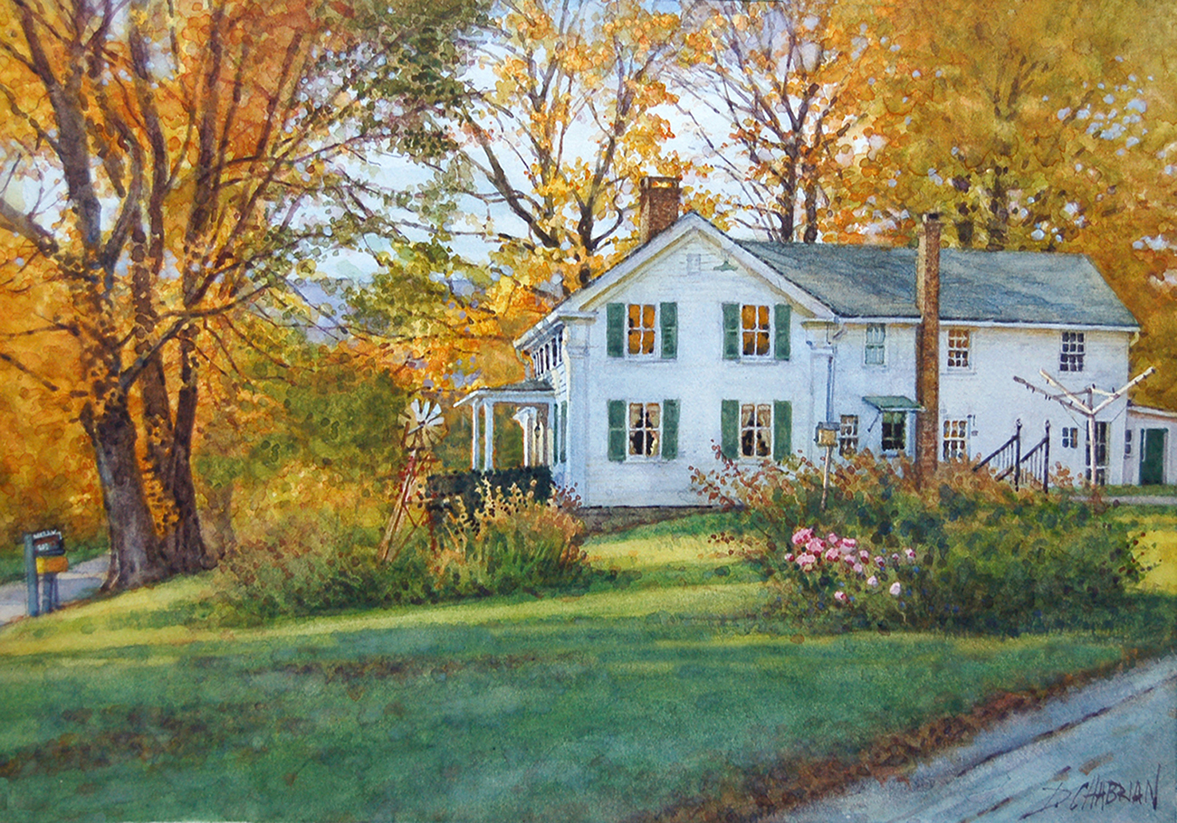 Season and landscape are often intimately linked in Chabrian’s work—they are visual cues that trigger poignant memories of home and reinforce our connection to place. An example of such a work (pictured below) depicts a white clapboard colonial bathed in a speckled light filtering through autumnal-hued oaks. Through the thinning tree line we capture of glimpse of nearby mountains. The viewer is positioned at a considerable distance from the house—as if standing on the country road that borders the property line. The distancing affords a somewhat removed view—a pictorial composition that implies a narrative. One has stepped back to admire the site or has come upon it for the first time. In either instance, the framing and stillness of the work suggests a halt—something important has caught the eye. Perhaps the painting recalls the first time the owner came upon the house, or maybe the day the deed was signed. Whatever the case, Chabrian's house portrait captures an enchanting moment—the air brisk and clean, the graceful lines of the house, the leafy surround, the distant peaks—all conspire to create a picture-perfect place to call home.