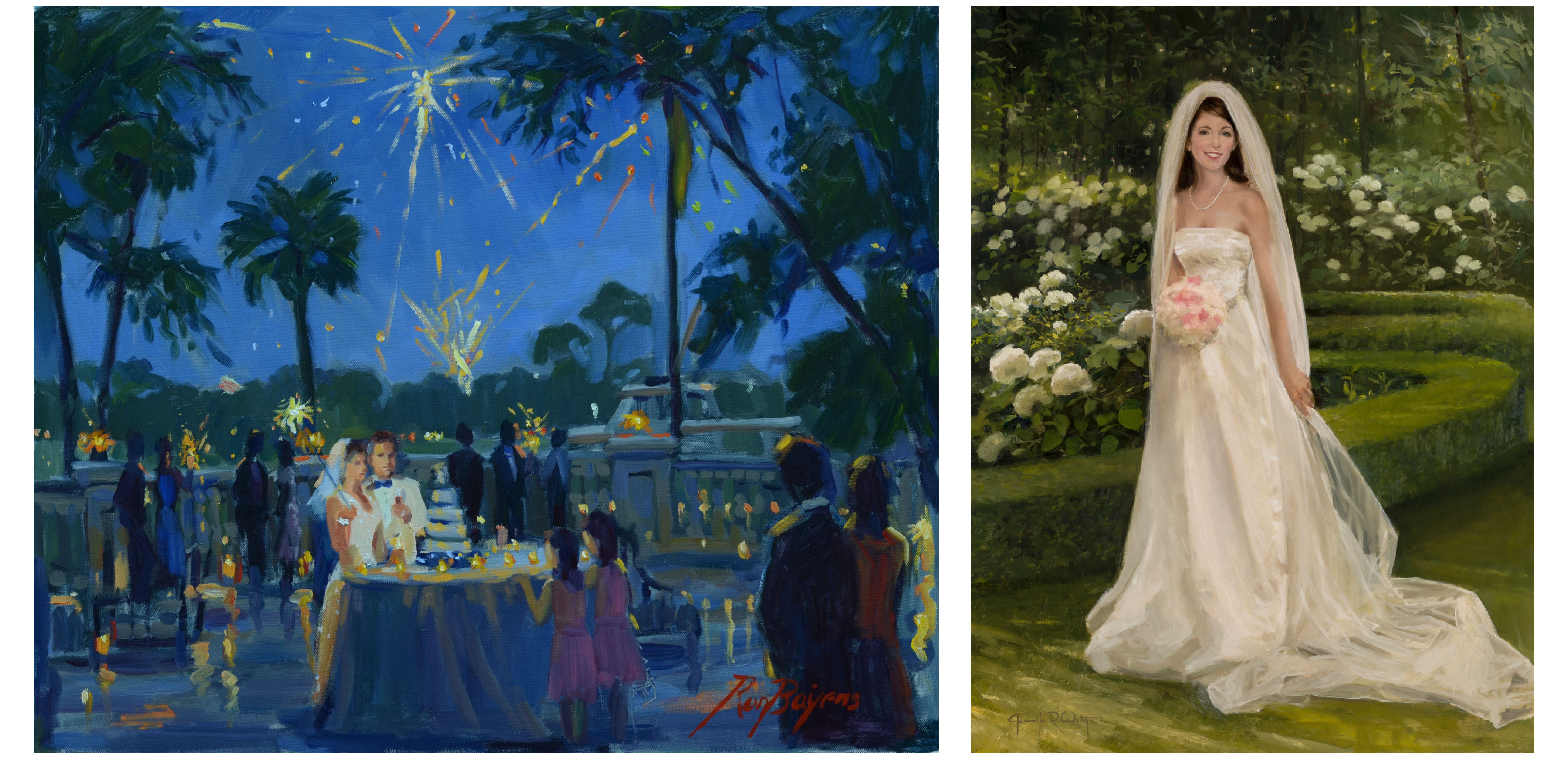 Each season brings new chapters in life. The fall and winter offer great opportunities to gift a portrait for the holidays. These seasons are not as filled with the special occasions depicted in portraiture, however with the approaching spring comes the season of school graduations and weddings. These are great opportunities to celebrate some of life's sweetest moments. We offer wedding portraits as live event paintings or after the event portraits from provided photographs. Whatever the big day may bring, portraits are a sure way to have and to hold the beginnings of a loving future forever