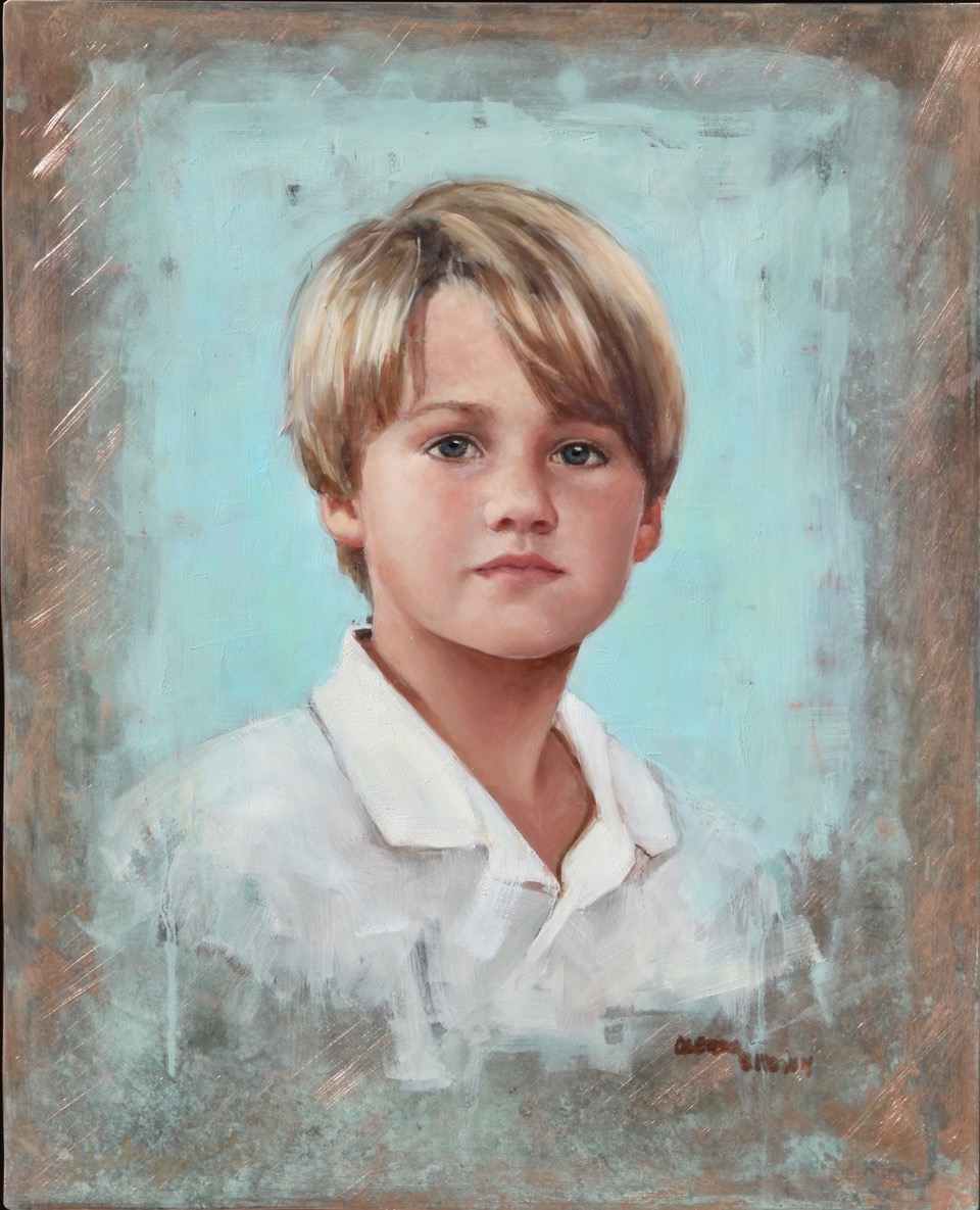 Artists can manipulate copper supports for a variety of effects that suit modern portraiture. The artist can chemically patina the copper to give it a blue-green hue before painting on it. The surface of copper is smooth, so the artists can sand it to varying degrees of “tooth” to create his or her desired finish. Painters may even choose to leave some of the copper unpainted in areas. All of these techniques lend a contemporary feeling to a very classical medium.
